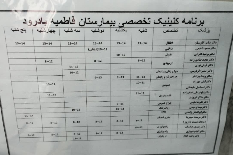 - برنامه کلینیک تخصصی بیمارستان فاطمیه بادرود